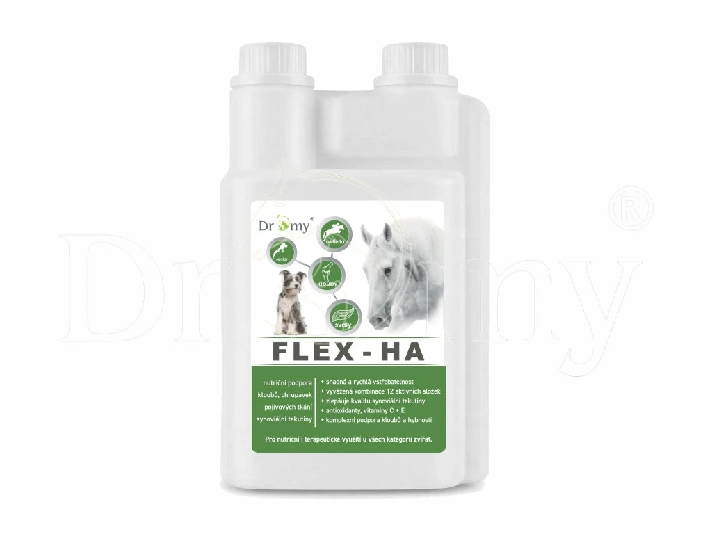 Dromy® FLEX HA je tekuté doplňkové krmivo pro koně a psy velkých plemen obsahující kombinaci látek minerálů, vitaminů a rostlinných extraktů, které jsou zásadní a potřebné pro podporu, vývoj a regeneraci kloubních chrupavek, vazů a šlach.