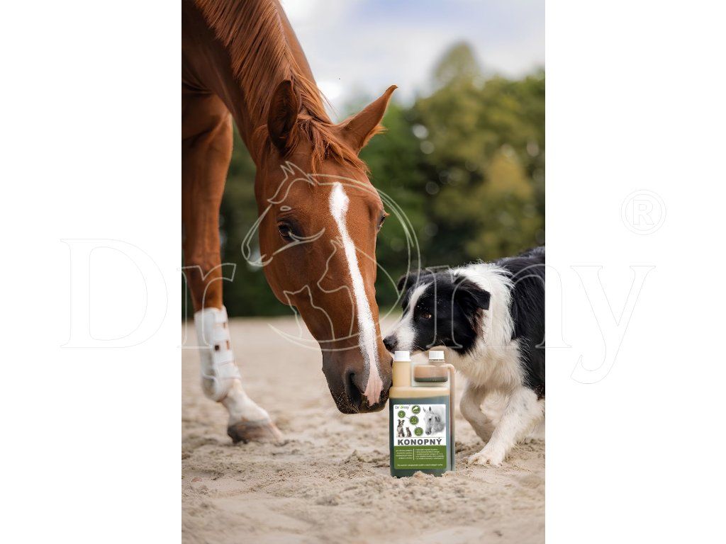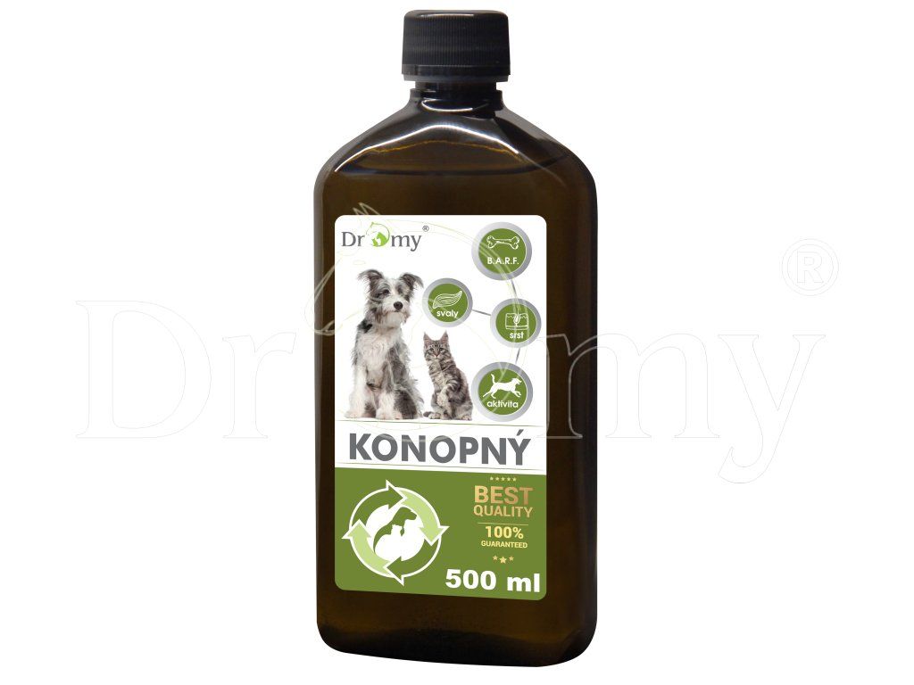 Za studena lisovaný Dromy® Konopný olej pro všechny kategorie koní, psů a koček určený k obohacení krmné dávky o esenciální mastné kyseliny, vitaminy, bez konzervantů a barviv, vysoké kvality.