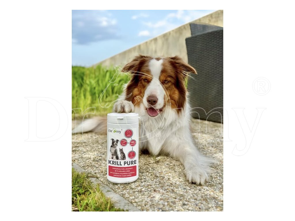 Krill PURE je doplňkové krmivo obsahující Krunýřovku krilovou - Euphausia superba s obsahem 55 % mořských bílkovin, 25 % krilového oleje bohatého na Omega -3 mastné kyseliny s dlouhým řetězcem (EPA 10 % a DHA 6 %) s vysokou vstřebatelností.